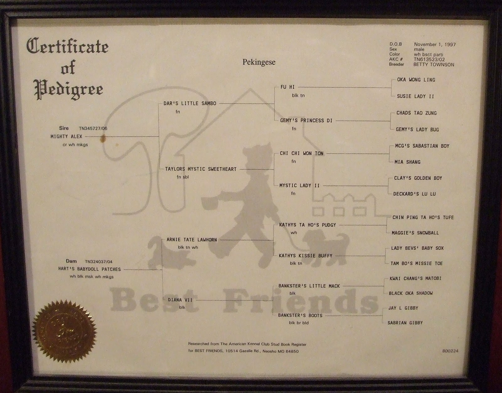 Born on Nov. 1. 1997 to Sire Mighty Alex and Dam Mart's Babydoll Patches he is a Pedigreed Pekingese in white/biscuit parti color.